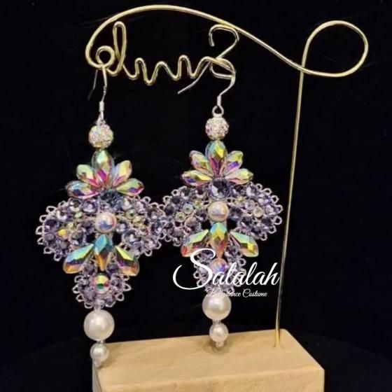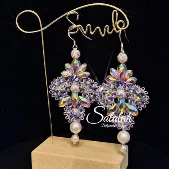 独特な素材と緻密な装飾が特徴です。レースベース素材を使用し、ミックスカラーのグラデーションシルバーと薄いパープルが美しいコントラストを生み出しています。ピアスが揺れるたびに、ビジューがきらきらと光り、顔の周りを華やかに演出します。